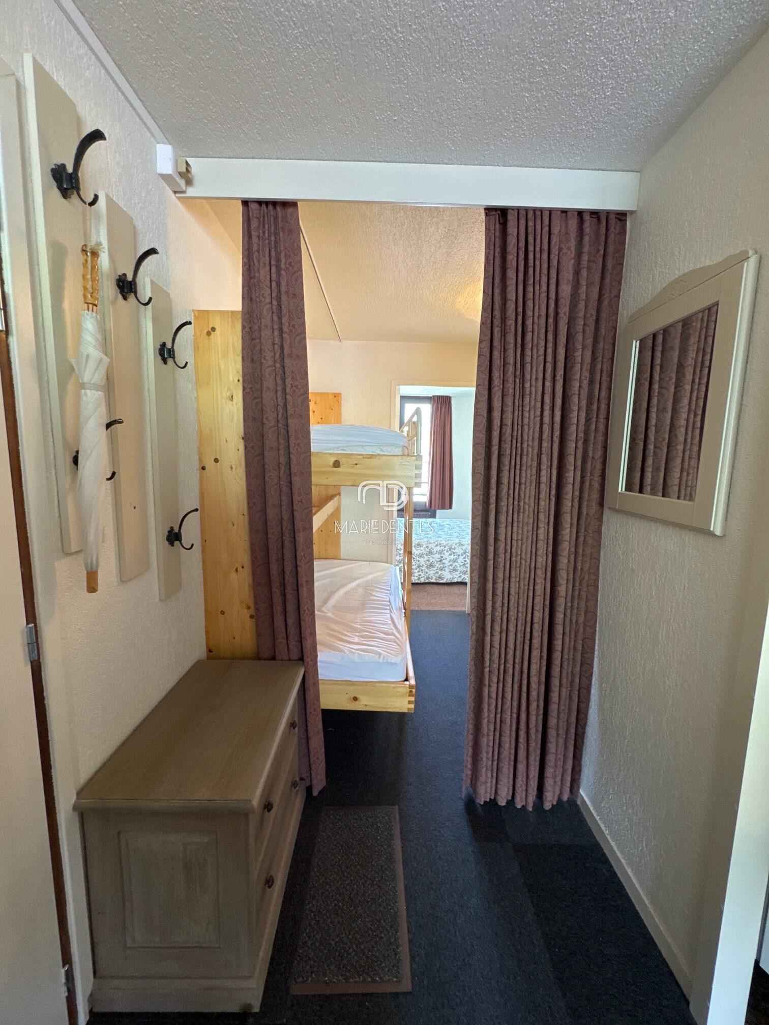 L’appartement est traversant : il est constitué de deux pièces principales avec un séjour très lumineux exposé Sud/Sud-Ouest et une chambre spacieuse avec cabinet de toilettes exposée Nord-Est ; cette pièce est très agréable aussi parce qu’elle bénéficie d’une jolie vue et du soleil le matin. La cuisine a été rénovée de manière ultra fonctionnelle, elle dispose d’un bar avec rangements ouvert sur le coin repas. La salle à manger permet d’accueillir au moins 8 personnes tout en laissant de la place pour le coin salon équipé de 2 lits gigogne et d’un canapé convertible. Un large espace coin nuit indépendant avec 2 lits superposés rabattables complète le couchage de la chambre et du séjour. Les wc sont indépendants de la salle de bain.