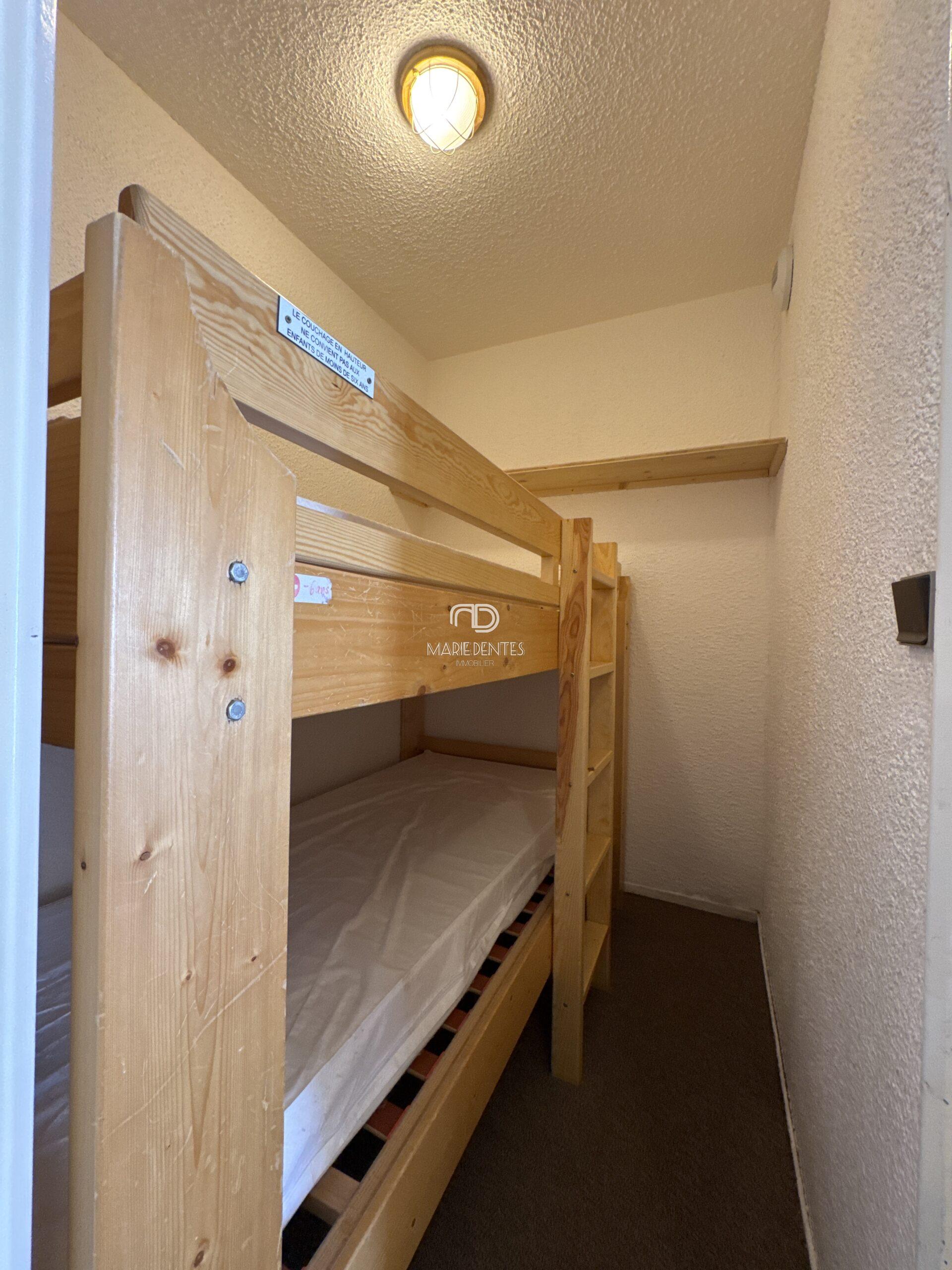 Il se compose d’une cabine à l’entrée avec lits superposés fixes, d’un coin montagne dans l’entrée avec 2 lits superposés rabattables, d’une salle de bains avec WC, ainsi que d’une cuisine avec passe-plat ouverte sur le séjour lumineux.
